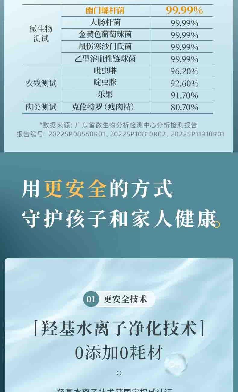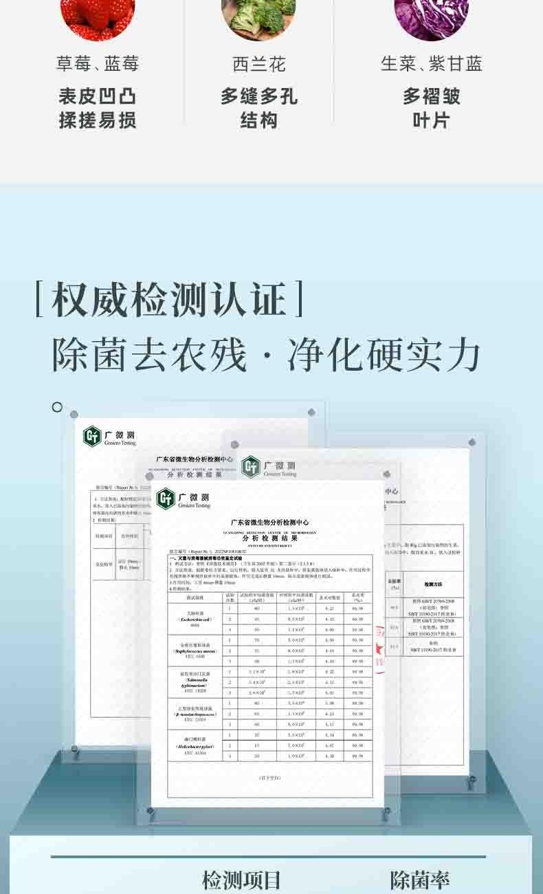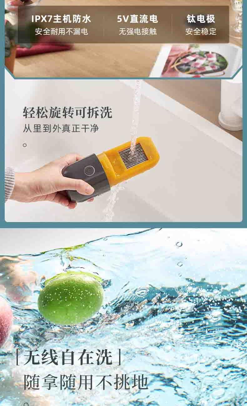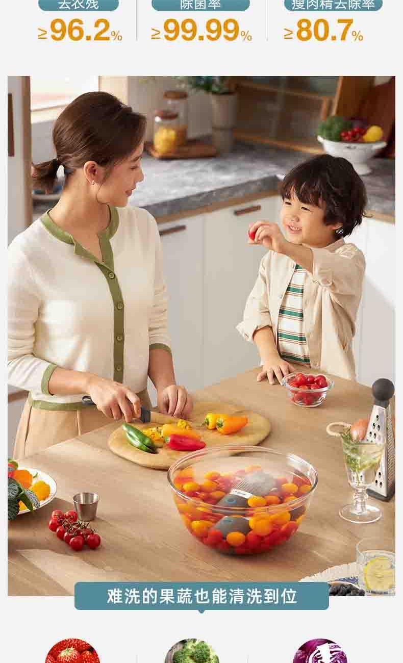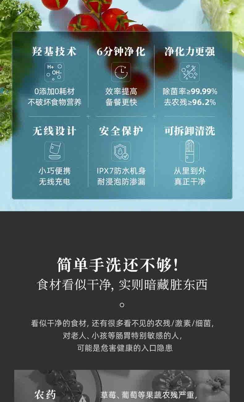 电池容量:2200mAh 功率:18W 毛重:0.52kg 产品尺寸:100*100*170mm 包装尺寸:214*152*164mm 默认每次工作=6分钟(3-5L容量的水)充满电可适用≥8次1.羟基技术,0添加0耗材,深度去农残 2.18W大功率充足气泡,6分钟净化备餐效率高 3.机身轻松可拆洗,从里到外真正干净