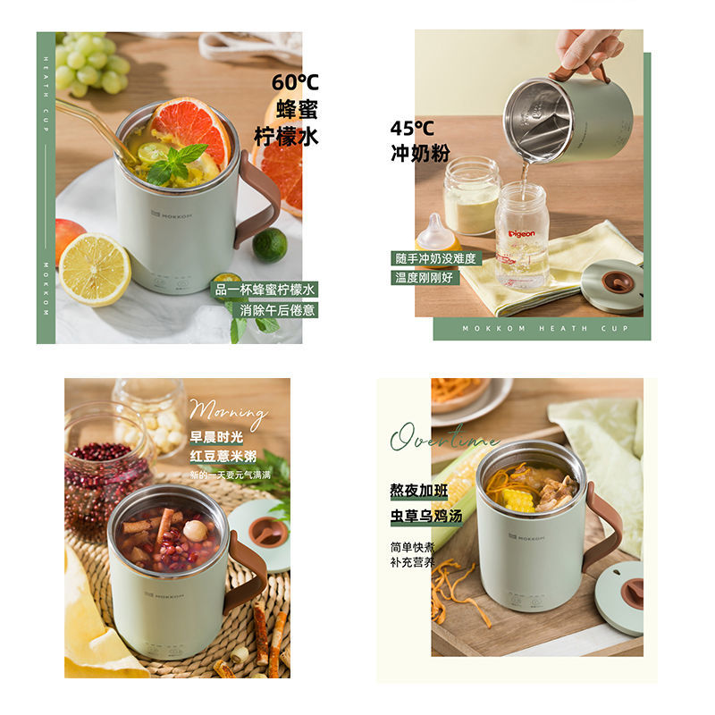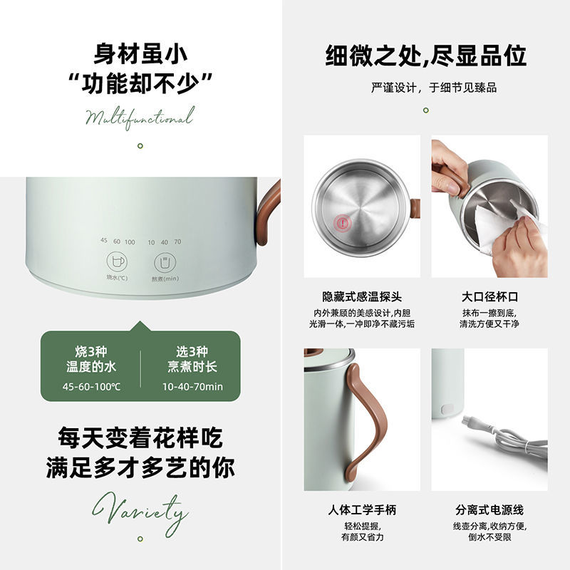 型号:MK-387豆蔻绿 额定电压 220V~ 额定功率300W 额定频率 50Hz 产品材质 PP/304不锈钢 产品尺寸94*120*126mm 彩盒尺寸 125x125x145mm 外箱尺寸 485*420*550 总箱毛重 21.5KG 电源线长度 0.8M 茶水分离,烧开水冲奶粉煲花茶煮粥羹,温度45℃,60℃,100℃可调 时间10分钟40分钟70分钟可调,居家旅行都可以